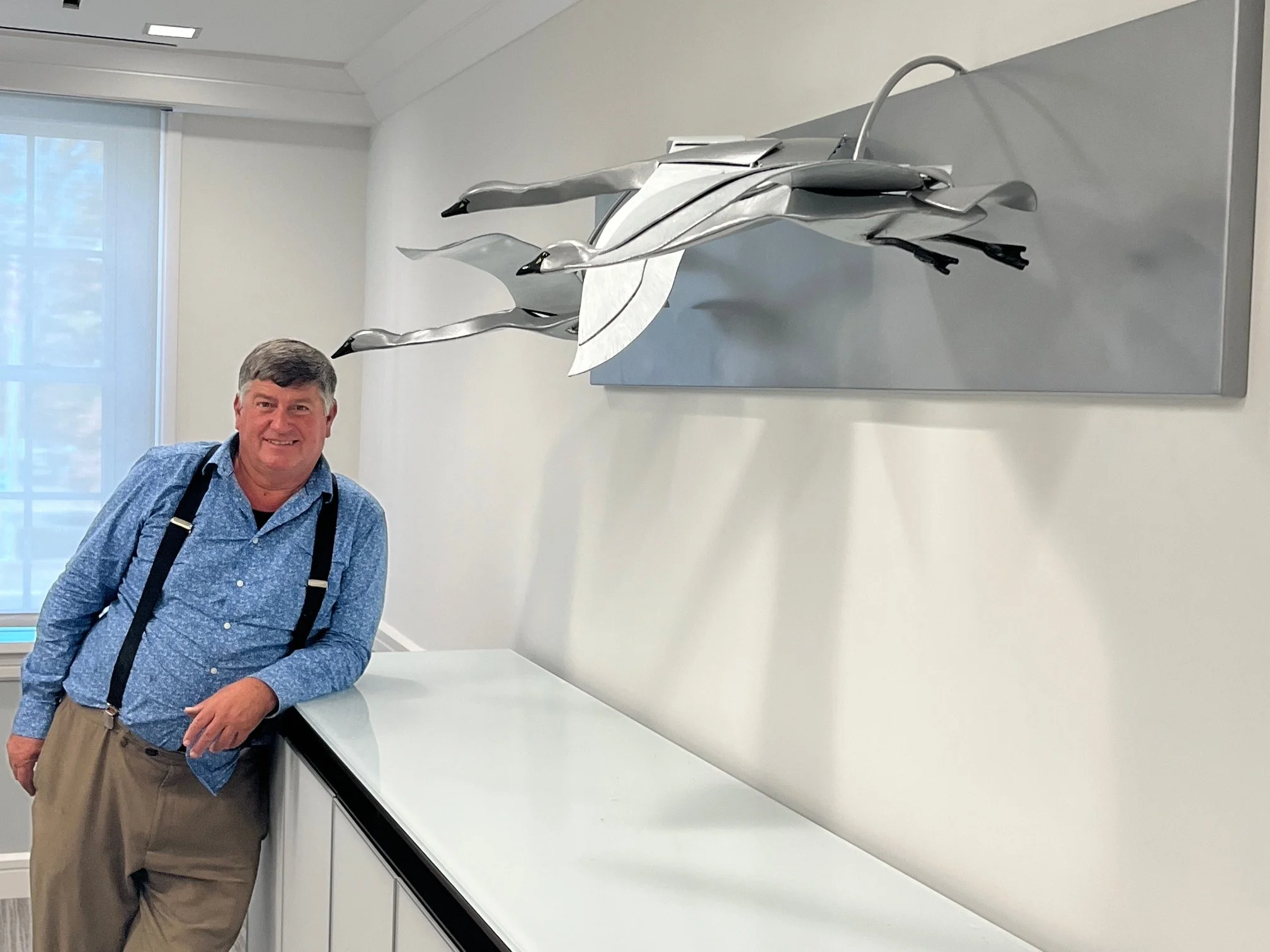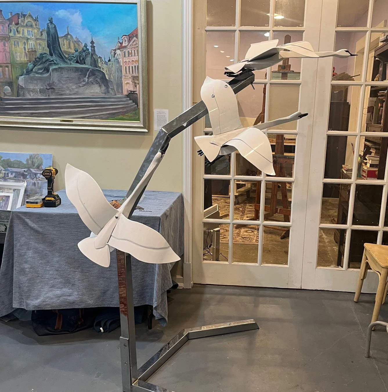 This piece, commissioned by Greenebaum Enterprises, has been completed and is awaiting installation at Maple Lawn, one of Greenebaum’s award-winning real estate developments in Howard County, Maryland. The stainless steel sculpture stands 15 feet high, with three swans spanning six feet ascending into flight. Each of the three swans has a wing span of six feet.